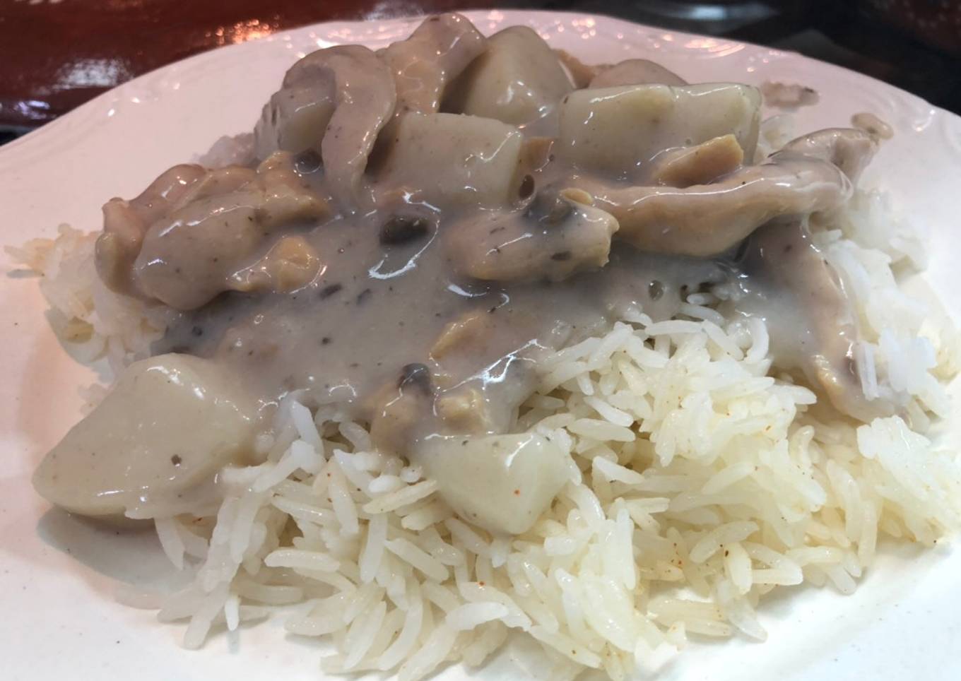 Ricas tiritas de Pollo ahogadas en crema de Champiñón