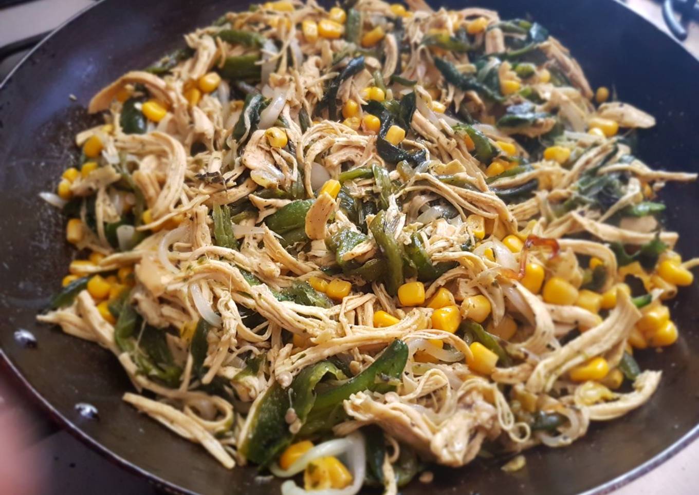 - Agregar el elote escurrido y el pollo deshebrado. Sazonar con el orégano, poca sal y pimienta, mezclar muy bien, permitir se cocine 5 minutos con el sartén tapado a fuego bajo (si es necesario agregar unas dos cucharadas de líquido, ya sea agua o caldo de la cocción del pollo).